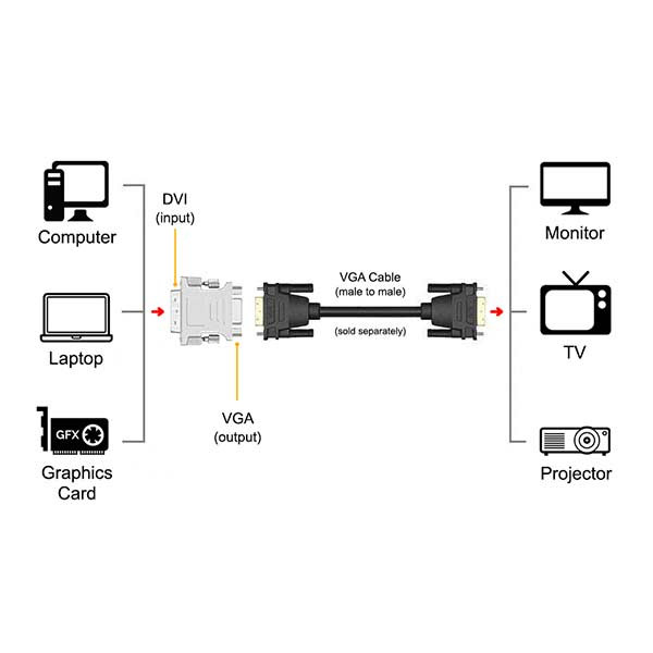 این آداپتور صفحه نمایش VGA شما را به منبع DVI متصل می کند ، یک سر کانکتورDVI نری را به یک رابط مادگی VGA تبدیل می کند ، که برای اتصال رایانه رومیزی یا لپ تاپ یا هر دستگاهی که خروجی DVI دارد ، به یک مانیتور یا پروژکتور VGA استفاده می شود.